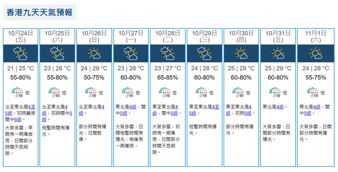 展望本港未來兩三日短暫時間有陽光,氣溫回升。明日(星期六)短暫時間有陽光,氣溫介乎23至28度。星期日(26日)部分時間有陽光,日間乾燥,氣溫介乎24至29度。