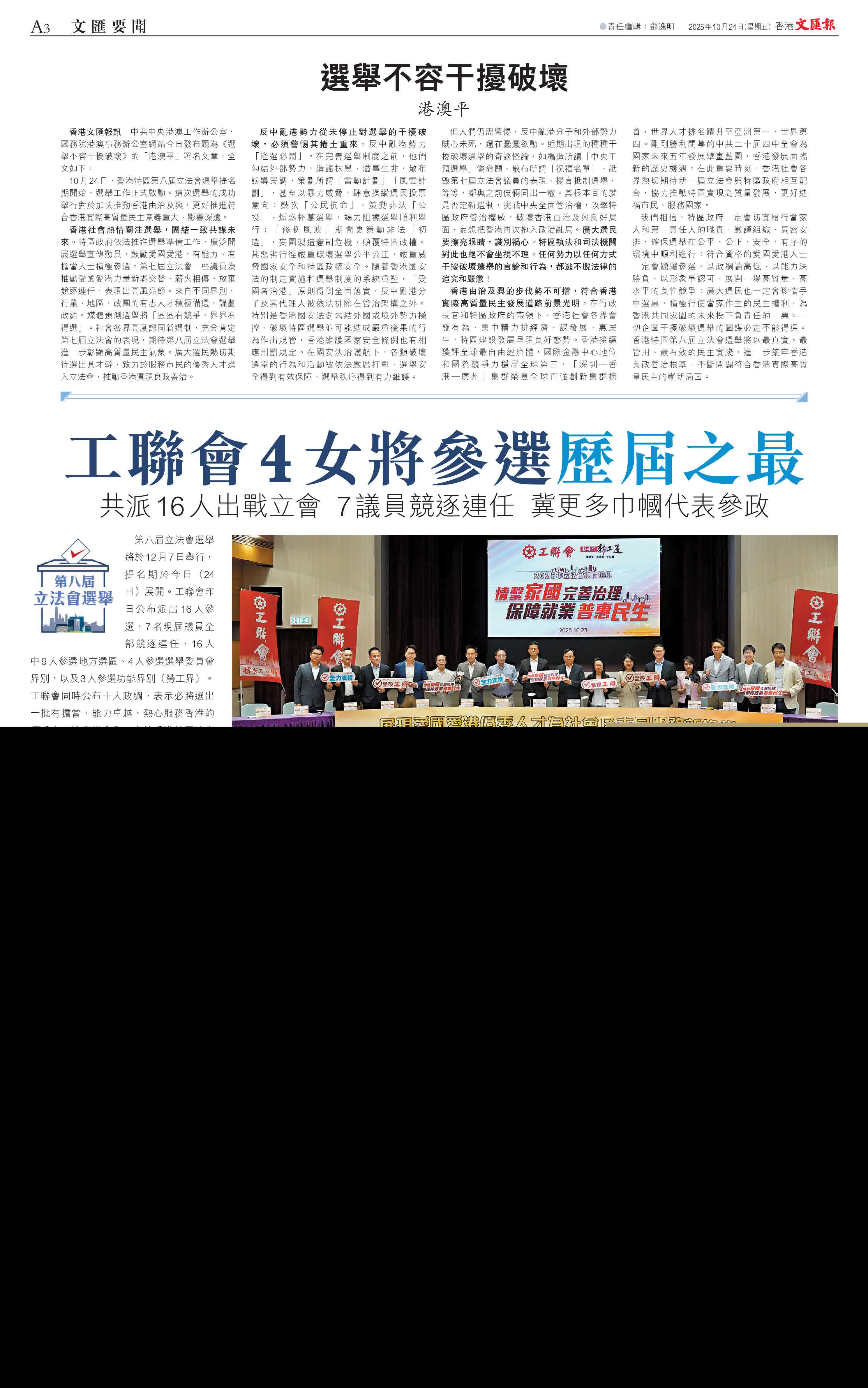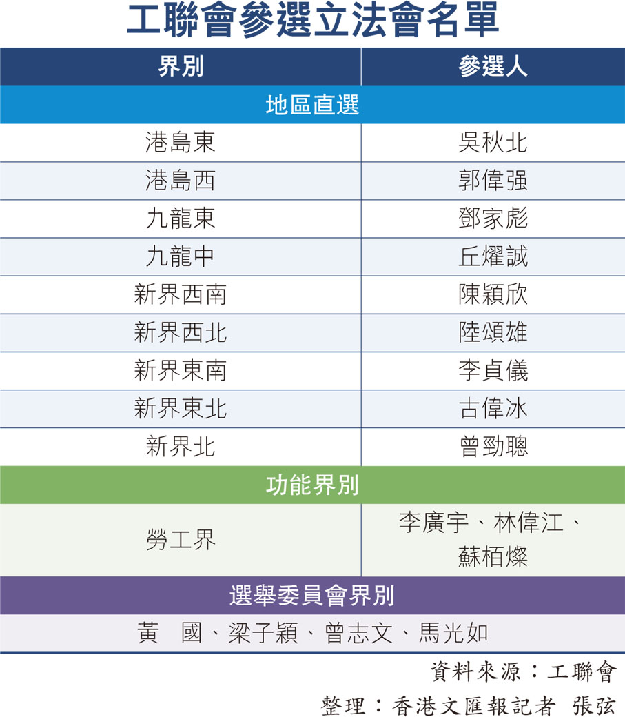 工聯會會長吳秋北表示,工聯會決議派出一個由16位愛國愛港、有能力、有擔當、有熱誠的骨幹成員組成強大團隊參選。團隊成員來自不同界別及地區,熟悉基層,專業務實,具備豐富的服務社區以及參政議政的經驗,是真正「想幹事、能幹事、幹成事」的堅定愛國者。