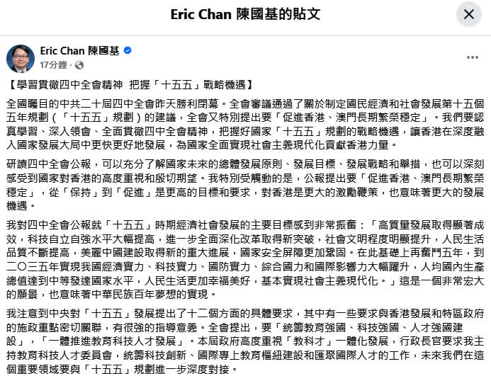 政務司司長陳國基今日(24日)在社交媒體發文表示,要認真學習、深入領會、全面貫徹四中全會精神,把握好國家「十五五」規劃的戰略機遇,讓香港在深度融入國家發展大局中更快更好地發展,為國家全面實現社會主義現代化貢獻香港力量。