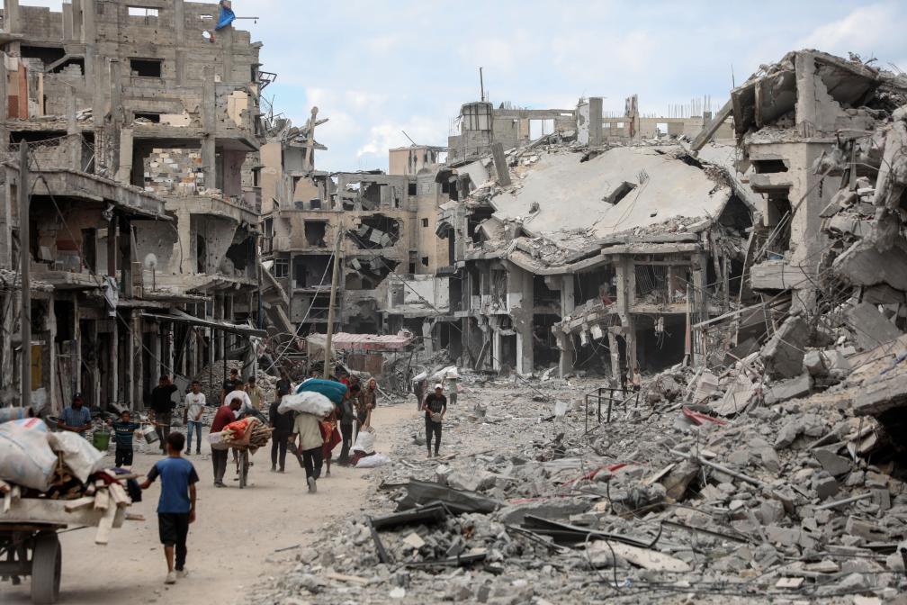 2025年10月12日,在加沙地带南部汗尤尼斯,重返家园的巴勒斯坦人走过严重受损的建筑。新华社发(里泽克·阿卜杜勒贾瓦德摄)