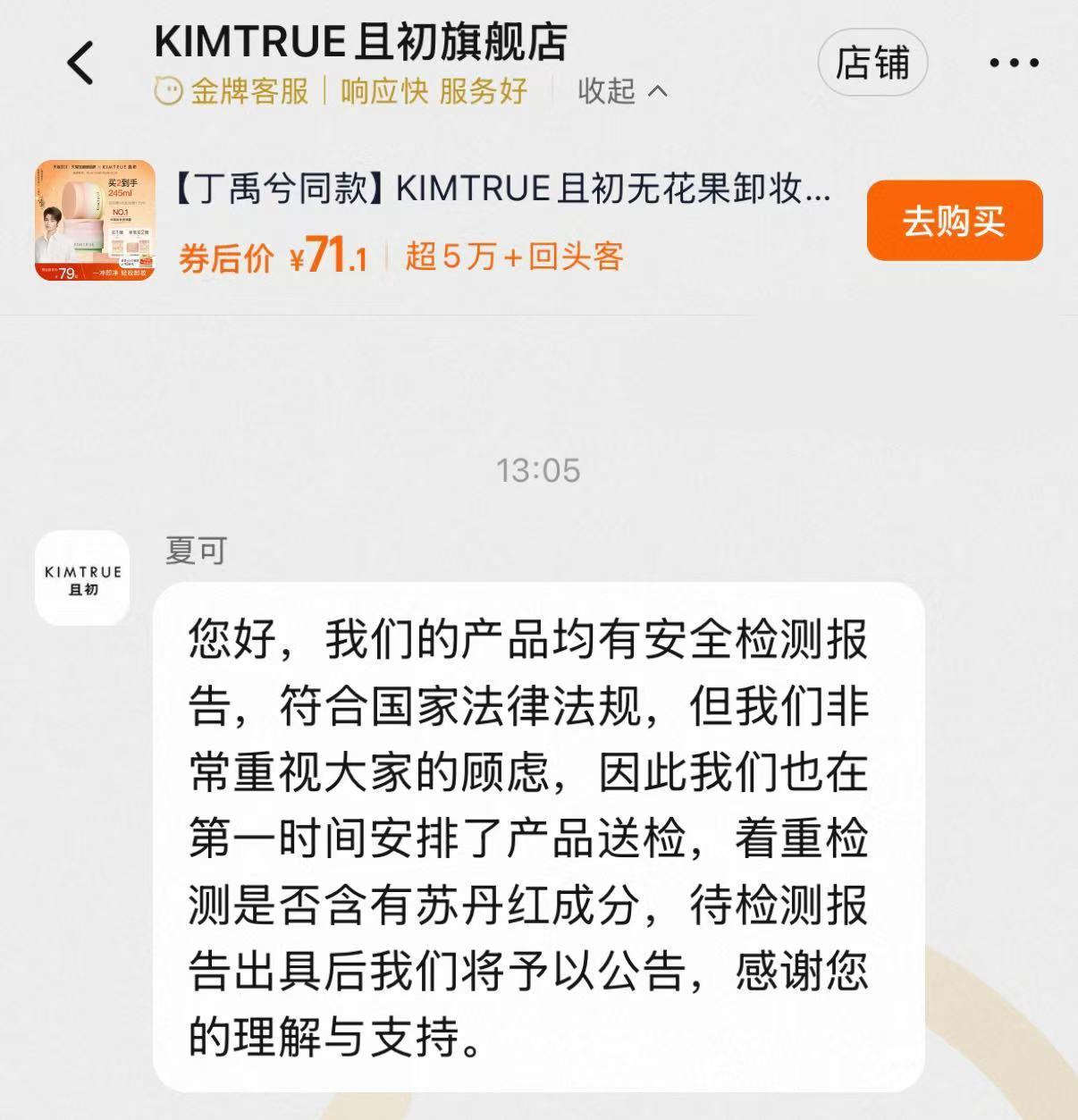 且初旗舰店客服表示,“产品均有安全检测报告,符合国家法律法规,但我们非常重视大家的顾虑,因此我们也在第一时间安排了产品送检,着重检测是否含有苏丹红成分,待检测报告出具后我们将予以公告”。玉容初旗舰店客服称,“产品生产严格遵守相关规定,关注到信息,第一时间把产品送检。”(记者 王蕾娜)