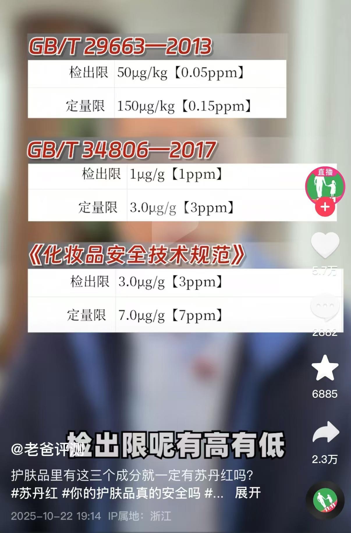 “老爸评测”称,苏丹红的检测方法有三种:GB/T29663-2013、GB/T34806-2017和《化妆品安全技术规范》,检出限分别为50ug/kg【0.05ppm】、1ug/kg【1ppm】、3.0ug/kg【3ppm】。
