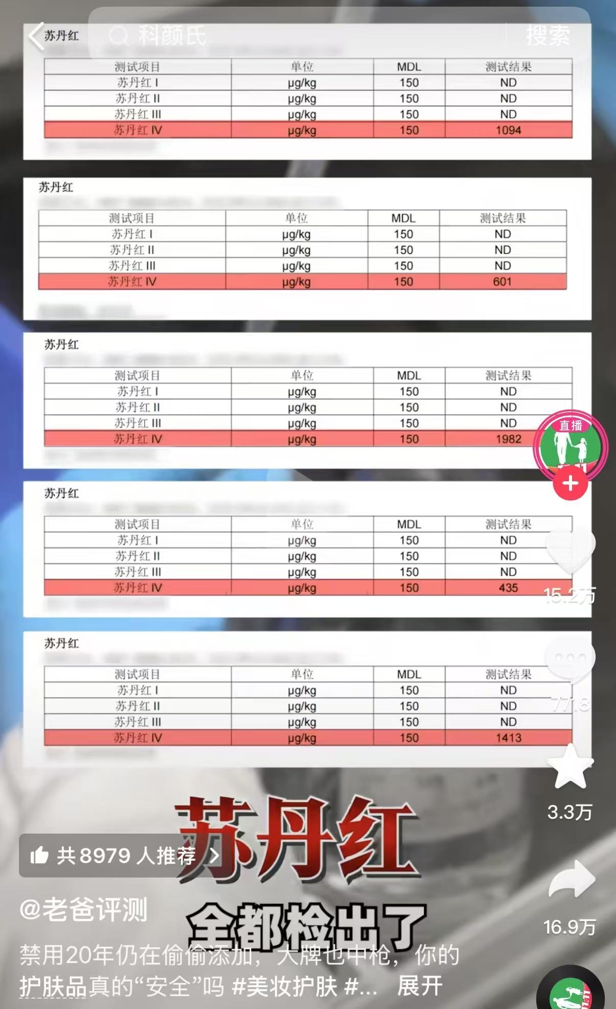 同时,“老爸评测”进一步对市面上多款使用同款原料的护肤品进行公证买样检测,结果均检出苏丹红成分。视频显示,多款化妆品均含有苏丹红Ⅳ,含量在435-1982ug/kg。“老爸评测”称,“天然色素不稳定,很容易褪色,所以原料商可能会偷偷添加人工色素,不知道有多少品牌方被蒙在鼓里。”