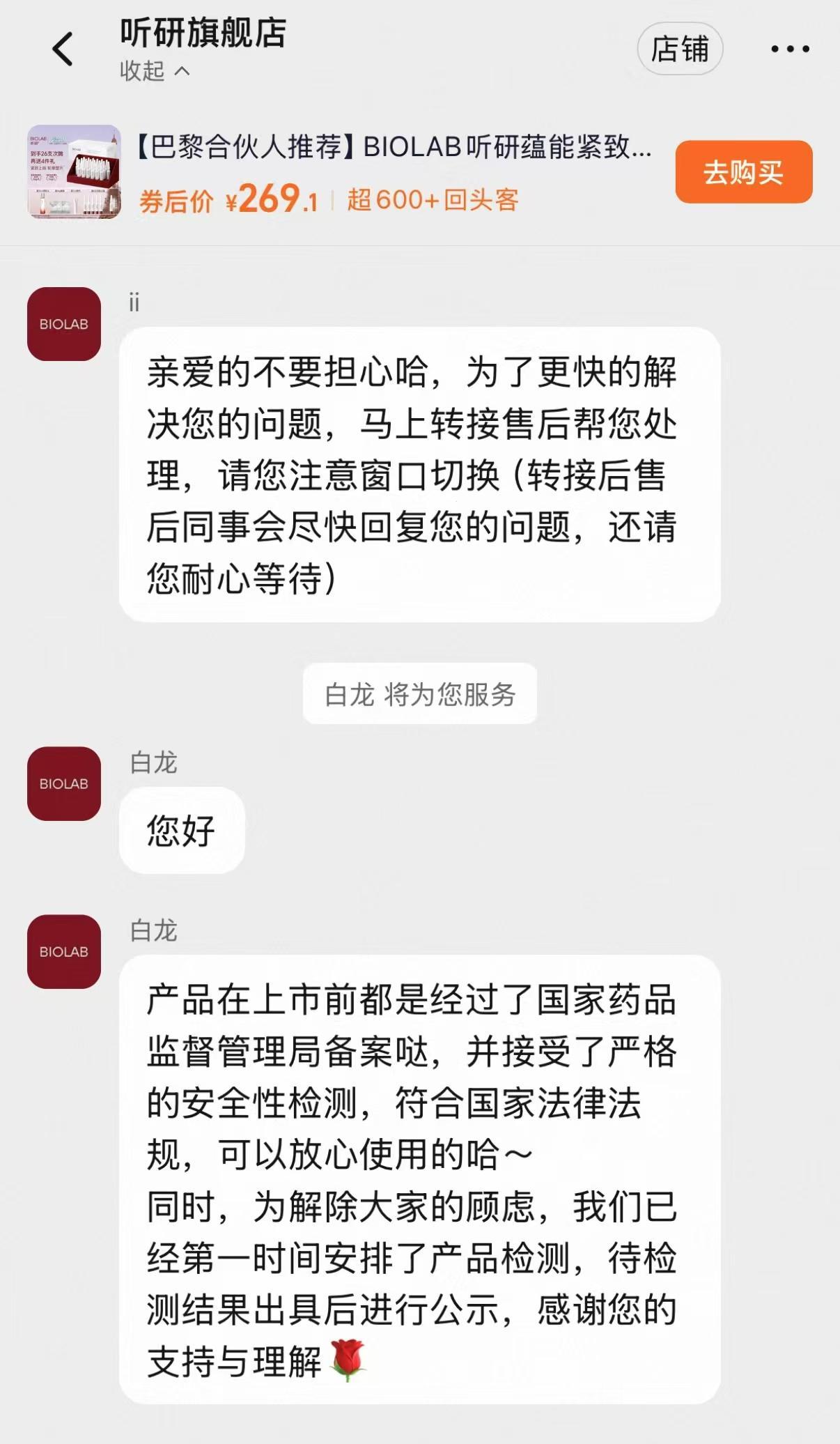 听研旗舰店客服告诉记者,“产品在上市前均经过国家药品监督管理局备案,并接受了严格的安全性检测,符合国家法律法规,可以放心使用”,同时,为了解除消费者顾虑,第一时间安排了产品检测,待检测结果出具后将进行公示。