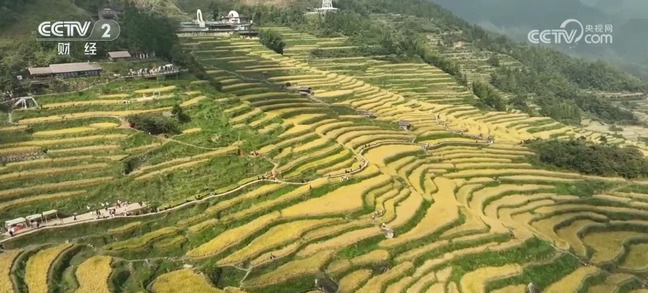 央视网消息:眼下,浙江丽水市的云和梯田进入最佳观赏期。金灿灿的水稻与山林、村庄相映成趣,不少游客专门来感受秋日田园风光。