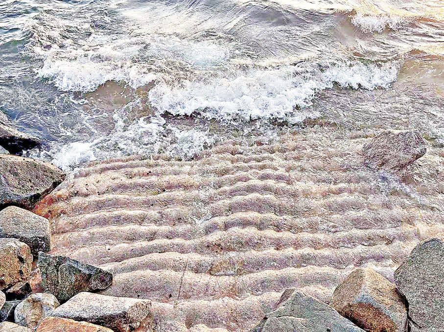 由瀑布出發,可沿石灘前往雞蛋仔石,並不能吃,而是形似雞蛋仔的塊狀岩石。石灘上亂石多,許多稍小的石頭踏上去還會晃動,因此要來一定記得穿上防滑的運動鞋。並且雞蛋仔石只有潮落時才會出現,常常是在日落時分近天黑時得見,大家切勿為了打卡忽視安全。慳妹到時,雞蛋仔石猶抱琵琶半遮面,不過太陽已逐漸墜入海平線,為海面撒上碎金,景色也格外美麗。