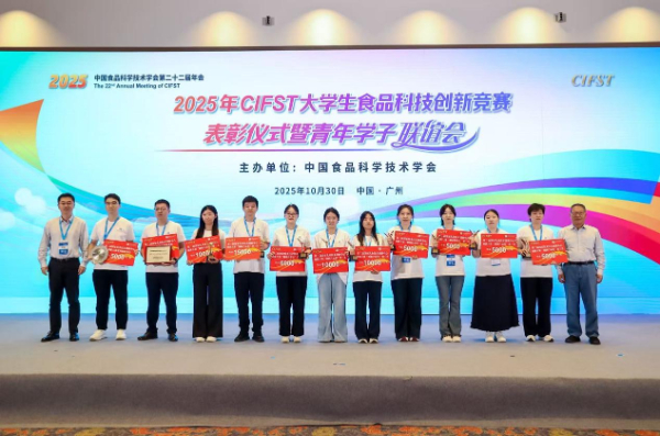 10月30日晚,“2025年大学生食品科技创新竞赛表彰仪式暨青年学子联谊会”会上,为最终评选出前三名共计9项,优秀作品13项,最受欢迎团队2项,优秀组织单位1校,最佳指导教师1人颁发奖项。