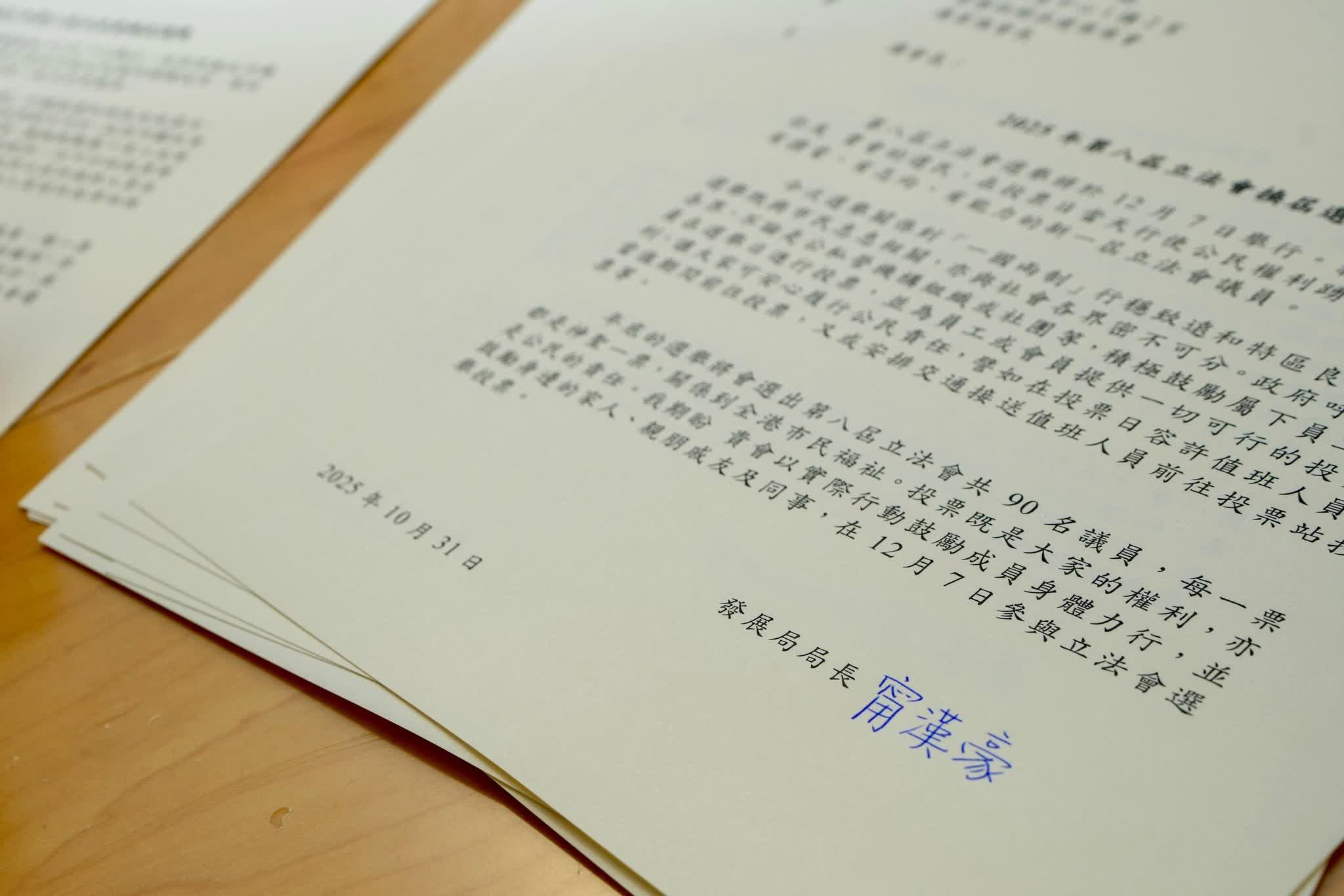 香港文匯報訊(記者 蕭景源)發展局局長甯漢豪今日(31日)發信予19個與局方有主要工作關係的法定機構、學會及商會組織,呼籲其成員在12月7日第八屆立法會選舉踴躍投票,行使公民權利選出有擔當、有志向、有能力的新一屆立法會議員。