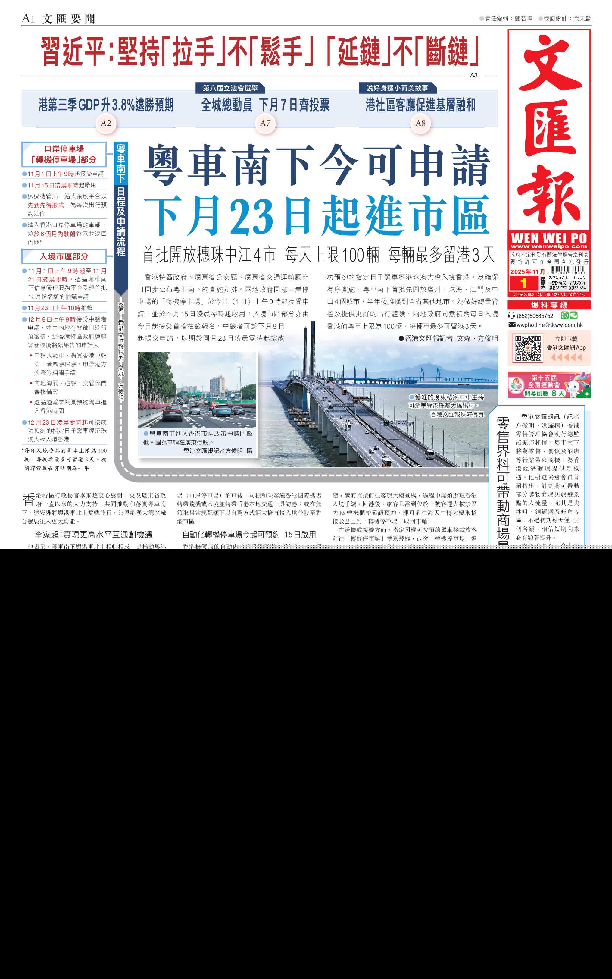他表示,粵車南下與港車北上相輔相成,是推動粵港澳大灣區融合發展的重要舉措,「這不僅促進粵港兩地居民『雙向奔赴』,實現更高水平的人流、物流互通,更同時開啟內地居民訪港新模式,為香港旅遊、零售及餐飲等行業帶來機遇。」特區政府正按照確保安全、有效分流、完備配套和簡便申請的策略,穩步推行粵車南下,讓香港居民和整體社會受惠,共同分享大灣區融合發展的豐碩成果。
