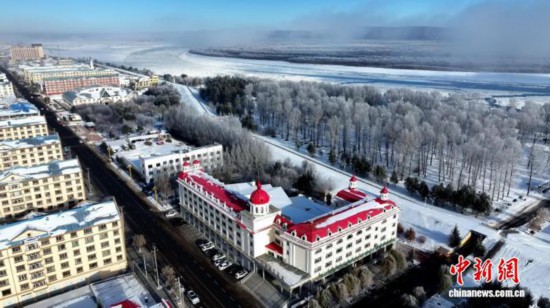 游客在呼玛一边欣赏雾凇一边玩雪。 王婷 摄