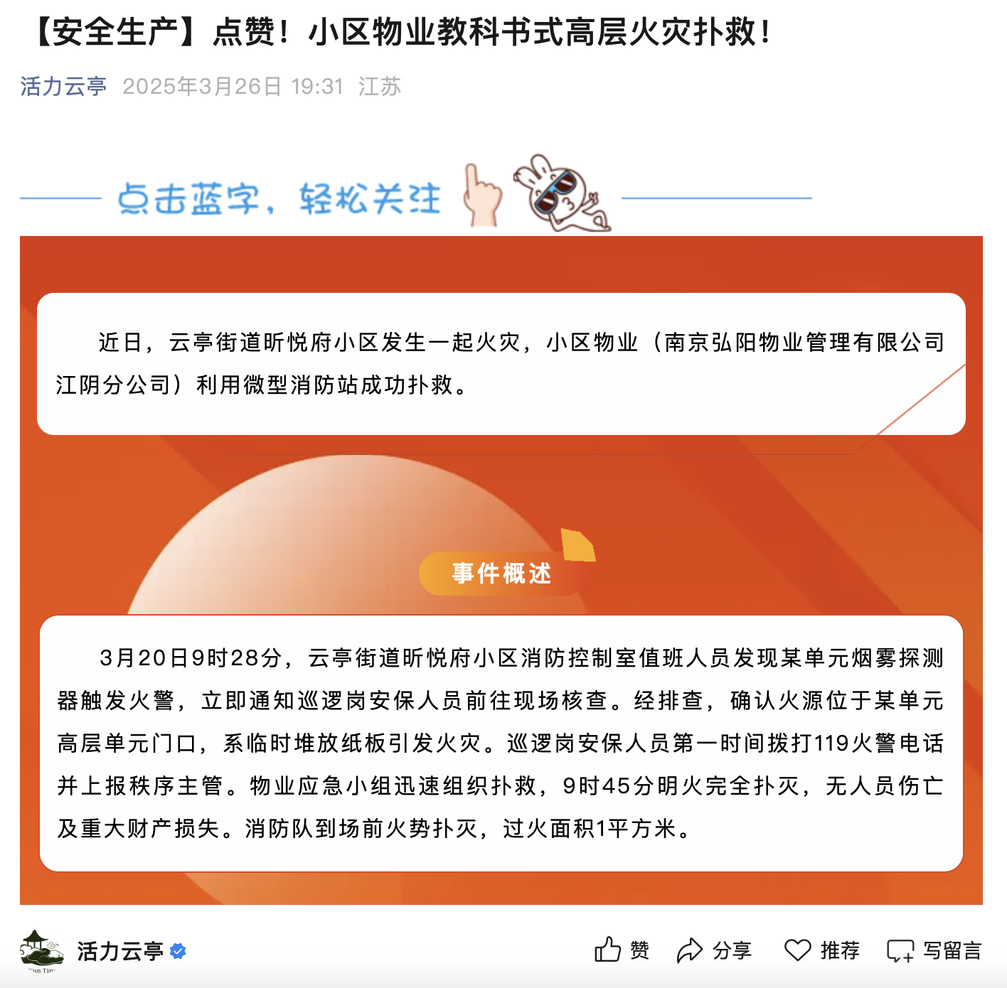 同时,该起火灾应急处置事件受到消防部门的高度关注与认可。消防部门专门撰文报道,赞扬昕悦府物业应急小组“响应迅速、处置专业、协作高效”,对物业自建的消防安全管理体系及实战能力给予充分肯定。