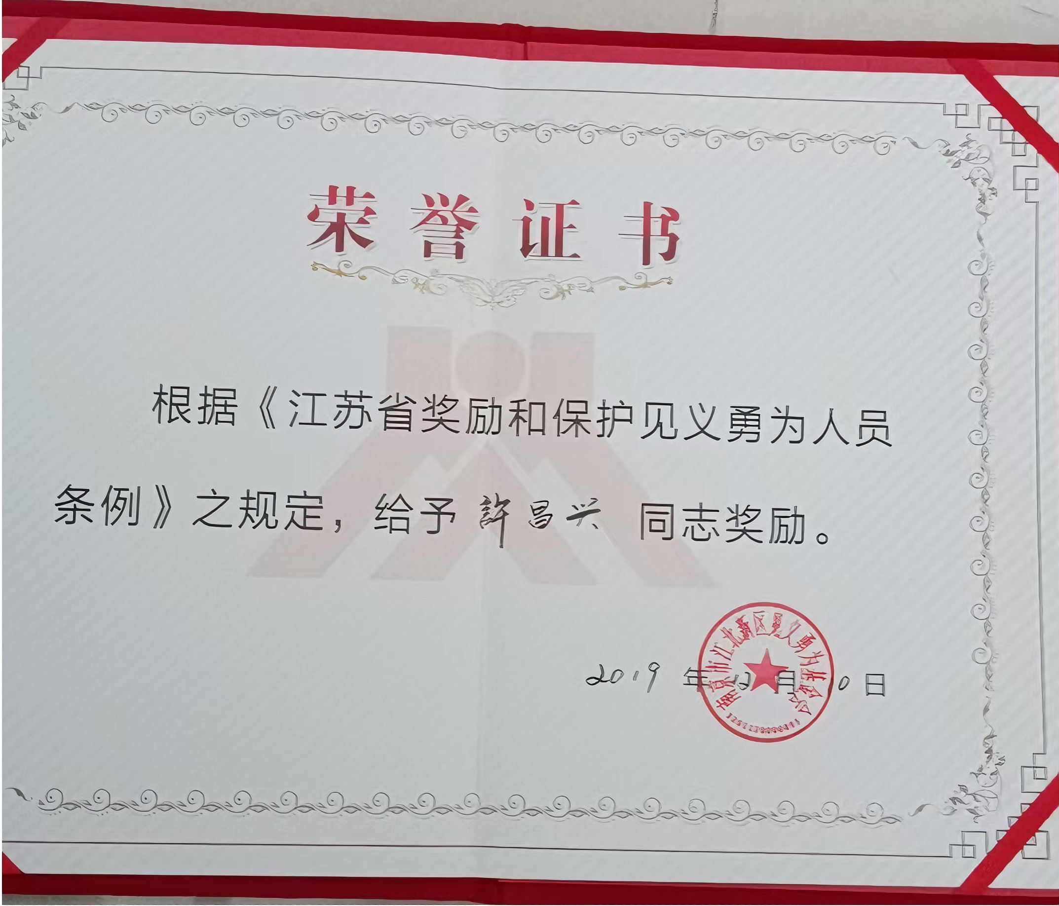 这次英勇行为避免了业主财产损失,维护了小区及周边治安。同年12月,许昌兴荣获“江北新区见义勇为奖”,面对赞誉,他只腼腆表示:“保护业主安全是本职工作。”