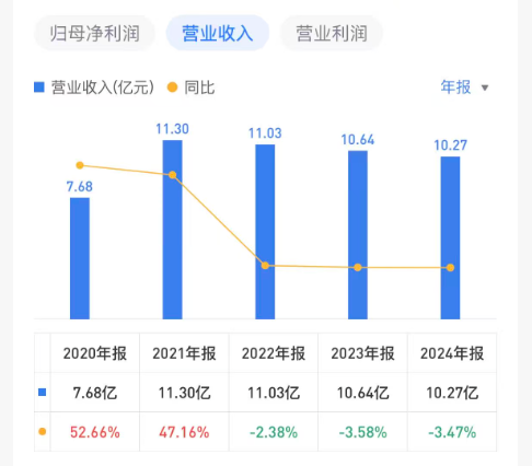 拉长时间线来看,2022年-2024年,弘阳服务营收分别为11.03亿元、10.64亿元、10.27亿元,分别同比减少2.38%、3.58%、3.47%。