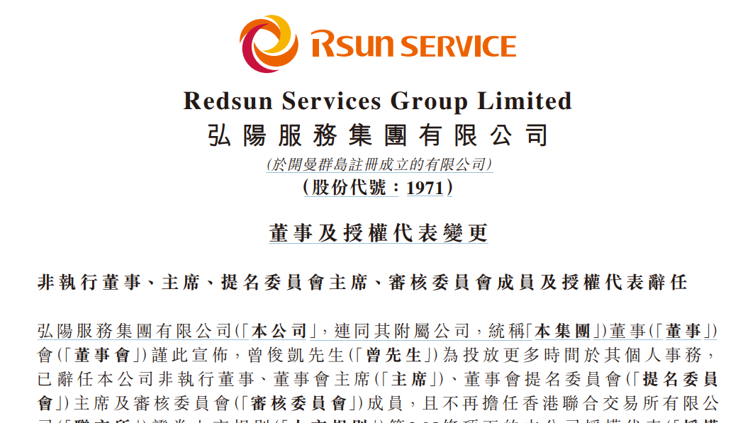 公告显示,曾俊凯为投放更多时间于其个人事务,已辞任公司非执行董事、董事会主席、董事会提名委员会主席及审核委员会成员,且不再担任香港联合交易所有限公司证券上市规则第3.05条项下的授权代表。