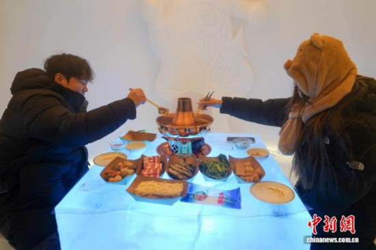 在用雪打造的屋子里,羊肉片、冻豆腐、青菜拼盘等食材已经摆好,陆续有游客前来体验雪屋火锅的“冷热交替”。“外面零下二三十度,吃着沸腾的火锅很刺激。”北京游客刘博俊说。