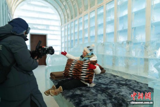 冰堡体验休息室布置了冰床、冰沙发等冰制陈设,让游客沉浸式体验冰雪住宿的新奇乐趣。 赵宇航 摄