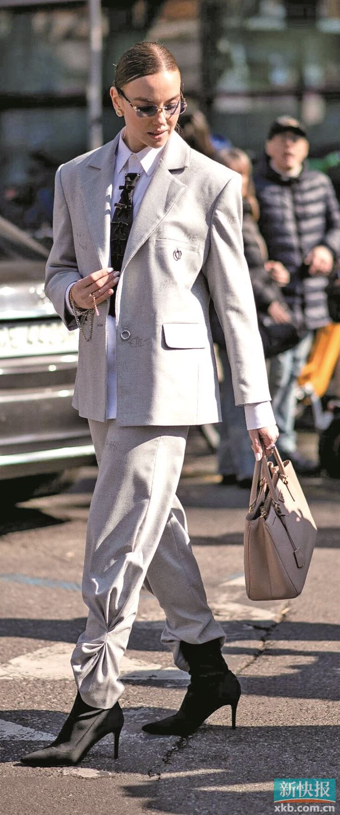 宽肩依然是核心元素,不过摒弃了过往的厚重垫肩而改用轻薄软质垫肩,搭配垂感面料的西装外套,既能修饰头身比又不会显强势压抑。