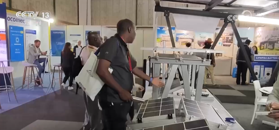 这个新能源产品可以说是非常具有非洲特色,它的上面是两片光伏板,下面是两个可以调整角度的摄像头,用光伏发电来支持摄像头的运行,还有把路灯、摄像头和光伏结合在一起的。