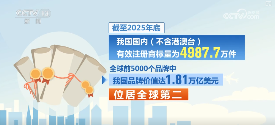 此外,截至2025年底,我国国内(不含港澳台)有效注册商标量为4987.7万件。全球前5000个品牌中,我国品牌价值达1.81万亿美元,位居全球第二。