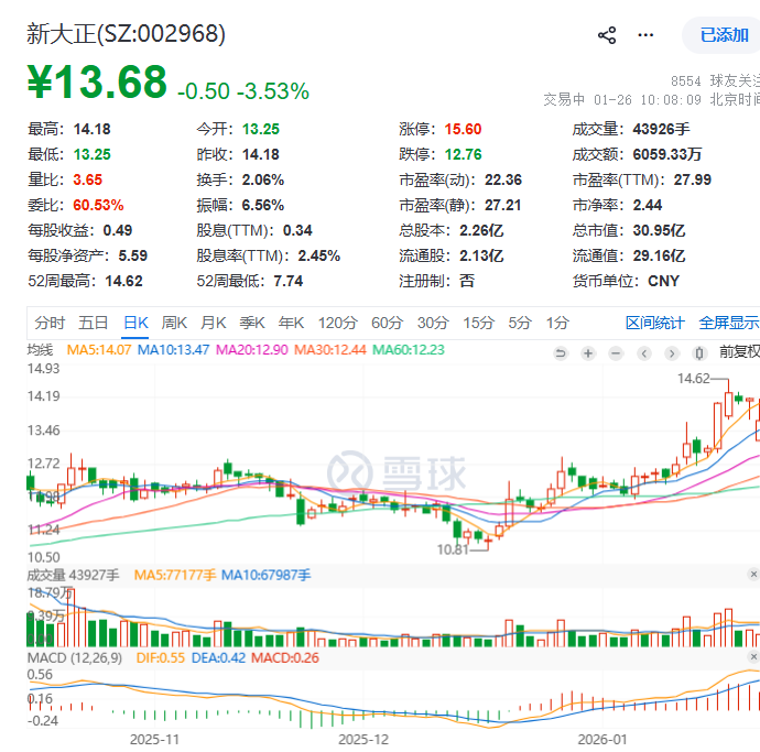截至1月26日上午10:08,新大正股价报13.68元/股,跌3.53%,总市值为30.95亿元。