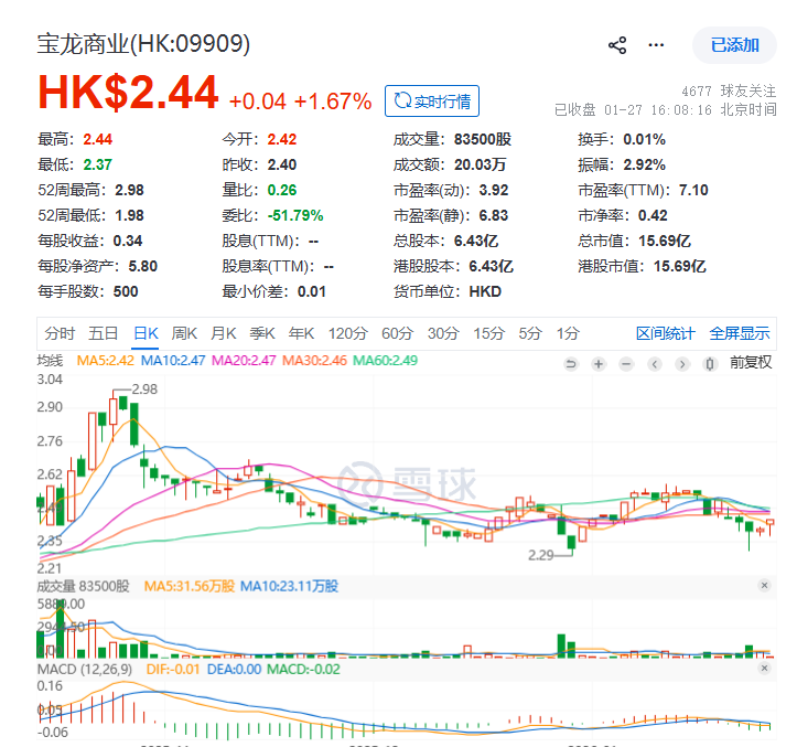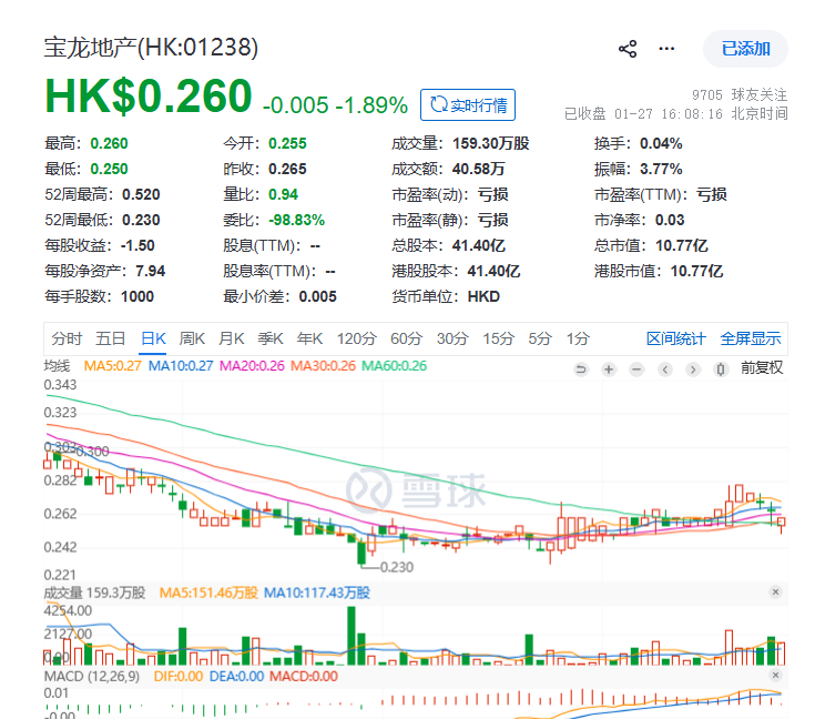 截至1月27日收盘,宝龙商业股价报2.44港元/股,总市值为15.69亿港元;宝龙地产股价报0.26港元/股,总市值为10.77亿港元。