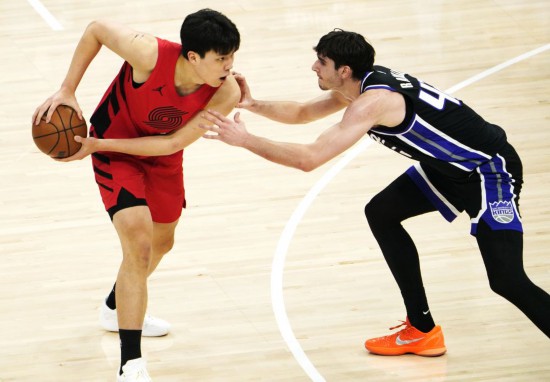 1月18日,开拓者队球员杨瀚森(左)在比赛中进攻。当日,在2025-2026赛季NBA常规赛中,波特兰开拓者队客场117:110战胜萨克拉门托国王队。新华社记者 吴晓凌 摄