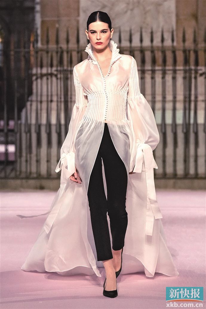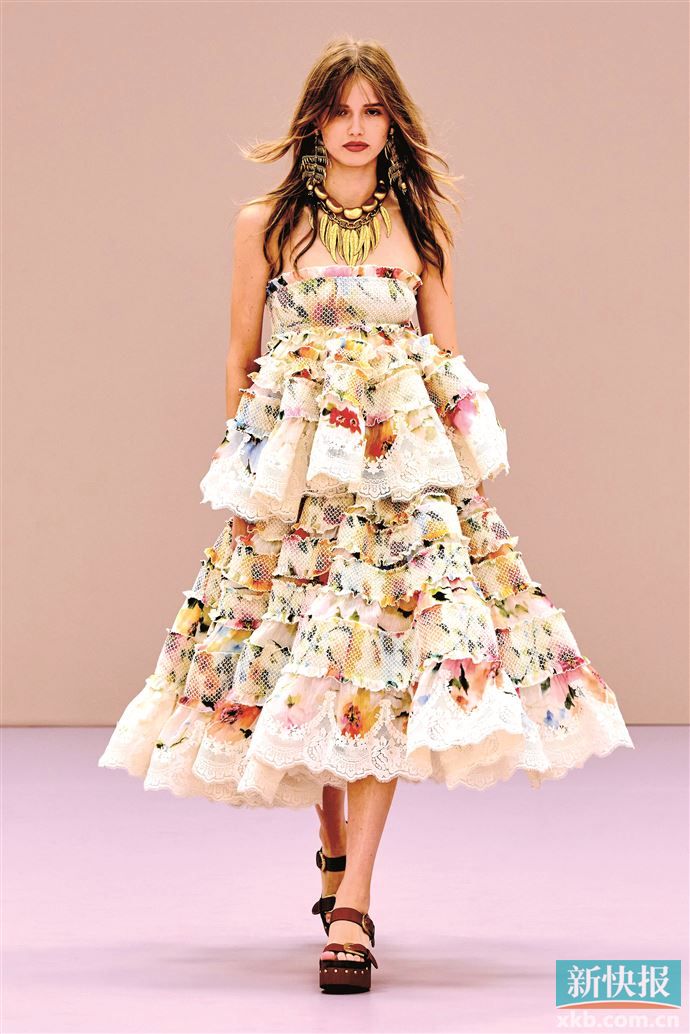 除了独立装饰带的应用,对面料本身的立体化处理也是古典戏剧风格中的重点,因而荷叶边的堆叠设计成为本季核心细节语言,设计师通过不同弧度与层数叠加,为优雅裙装注入量感与氛围感。领口的荷叶边堆叠打造出高领般的复古轮廓,弱化颈部线条的单调。裙摆处的层叠荷叶边则随廓形自然舒展,与裙撑的蓬松感相互呼应,形成虚实交织的视觉效果。(记者 梁彧)