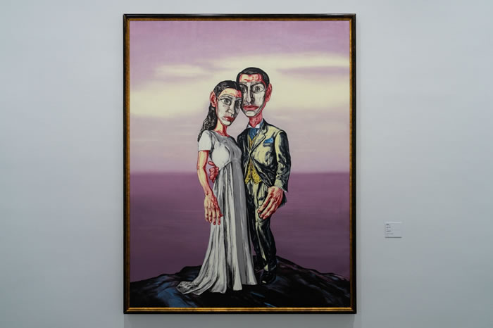 曾梵志《婚礼》因新娘的白色婚纱被纳入白色单元,策展人借此打破了“单色展厅”的绝对界限,暗示白色在不同文化语境中的多元解读。画作中扭曲的人物面容与柔和的白色婚纱形成对比。