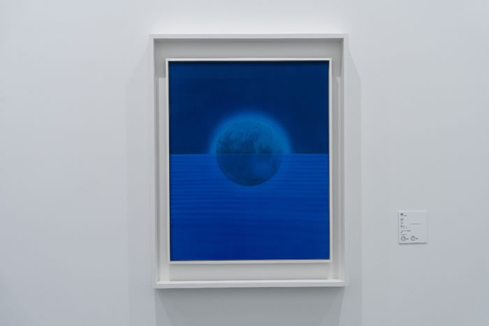 徐累的作品《海上月》以东方水墨语言演绎蓝色,蓝黑渐变营造出幽远空灵的意境,在传统水墨意境中拓展出当代的色彩表达维度。徐累曾说:“过去我们遥望月亮的时候,总是想到上面有嫦娥、月兔。但当现在用科学的眼光,以一个人类身份对月球进行探索时,月亮好像就变得无趣了。然而对于我而言,它依然充满了魅力。我们现在看着月亮的时候,跟过去发挥想象力的观察完全不一样。我们所看到的那些密密麻麻的陨石坑都是很有趣的。月亮是个永恒的主题,我希望对它进行一种另类化的解释。”