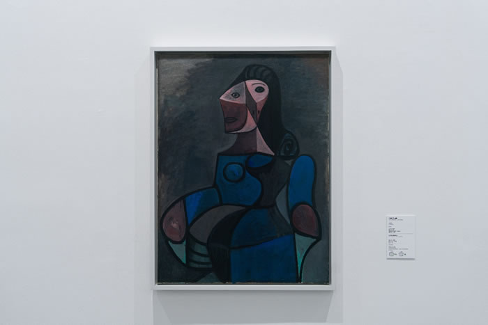 毕加索《蓝衣女人》是其立体主义晚期作品,褪去蓝色时期的忧郁,以浓郁蓝色描绘身体的主要部分,形成视觉锚点,在深色的背景前凸显出来,借蓝色传递战时情绪的压抑与疏离。