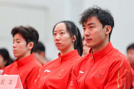 1月27日,钢架雪车运动员殷正(右一)、赵丹(右二)在米兰冬奥会中国体育代表团成立动员大会上。新华社记者 那宇奇 摄