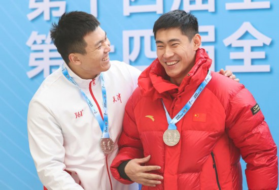 2023年11月28日,获得亚军的孙楷智/丁嵩(左)在颁奖仪式上。当日,第十四届全国冬季运动会男子双人雪车颁奖仪式在国家雪车雪橇中心举行。新华社记者 王楷焱 摄