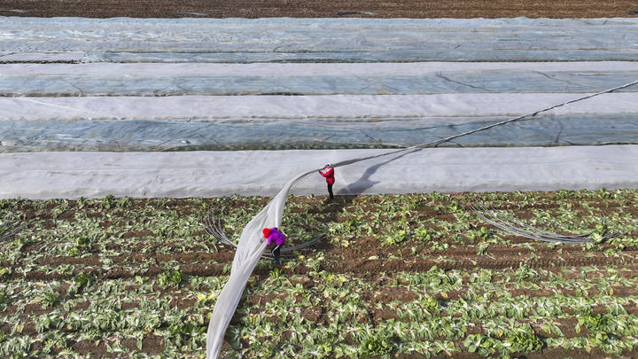 2025年12月11日,在山东省东营市广饶县李鹊镇,农民为作物覆盖防寒无纺布,应对寒潮(无人机照片)。新华社发(刘云杰 摄)