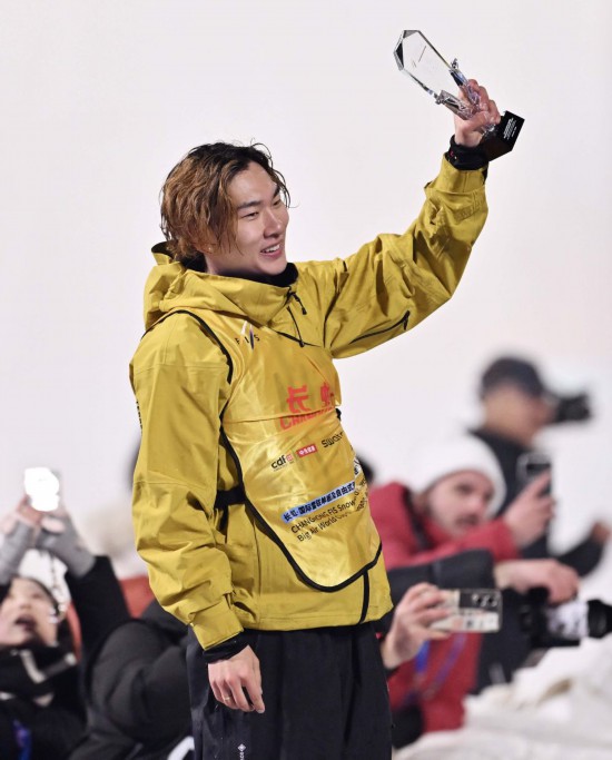 2025年12月6日,冠军中国选手苏翊鸣在2025-2026赛季国际雪联单板及自由式滑雪大跳台世界杯北京站单板滑雪大跳台男子组颁奖仪式后向观众致意。新华社记者 陶希夷 摄