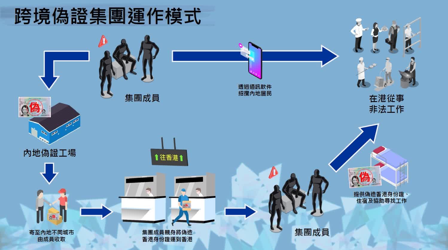 去年八月,內地執法機關發現一個跨境偽證集團,在內地透過手機通訊程式開設群組,招攬內地居民來香港非法工作。在這些群組內,犯罪集團以安排偽造香港身份證、提供宿舍及協助搵工的一條龍服務作招徠,吸引內地居民來香港打黑工。接着,犯罪集團會替擬來香港打黑工的內地居民製作偽造香港身份證,並將製成的偽造香港身份證寄往內地不同城巿,然後安排集團成員在收件後,由內地親身運送偽造身份證到香港。他們至會將偽造身份證藏在隱蔽地方,例如鞋底,意圖逃避口岸執法人員的檢查。在內地居民來香港時,集團成員會將偽造身份證分發予他們,並向他們提供宿舍及協助他們使用偽造身份證搵工。