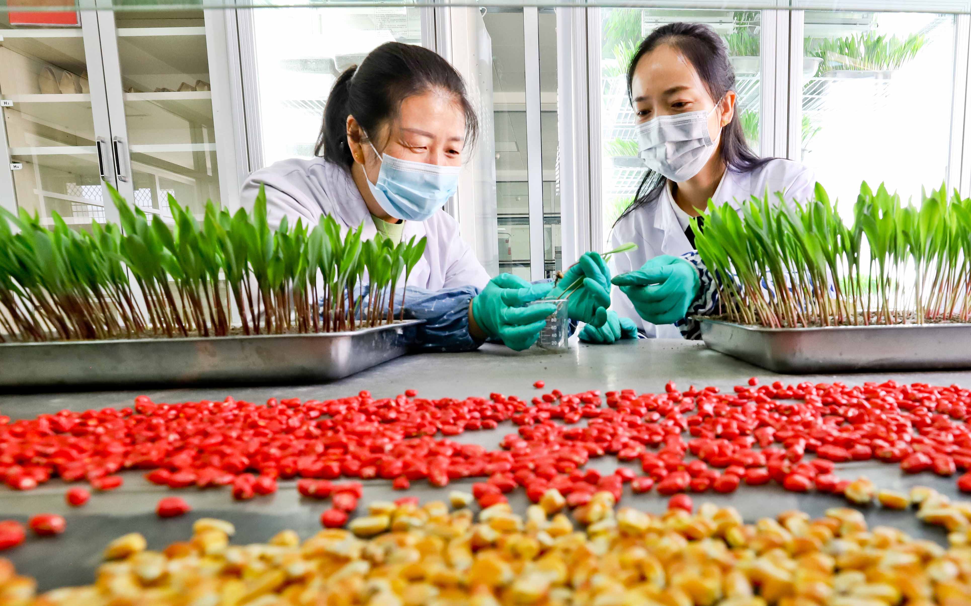 工作人员正在检验优质制种玉米良种发芽情况。冯杰 摄