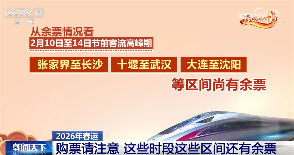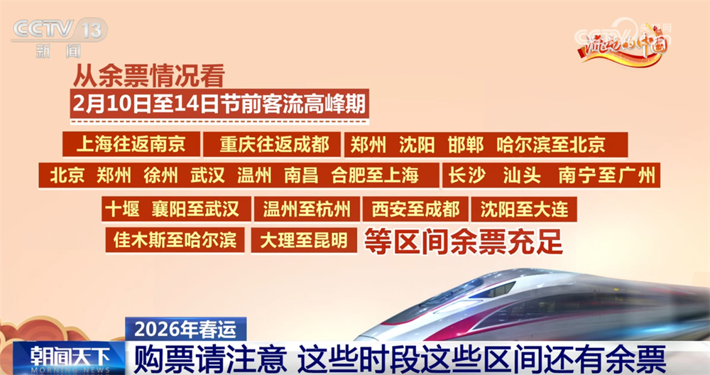 从余票情况看,2月10日至14日节前客流高峰期,上海往返南京,重庆往返成都,郑州、沈阳、邯郸、哈尔滨至北京,北京、郑州、徐州、武汉、温州、南昌、合肥至上海,长沙、汕头、南宁至广州,十堰、襄阳至武汉,温州至杭州,西安至成都,沈阳至大连,佳木斯至哈尔滨,大理至昆明等区间余票充足;张家界至长沙,十堰至武汉,大连至沈阳等区间尚有余票。