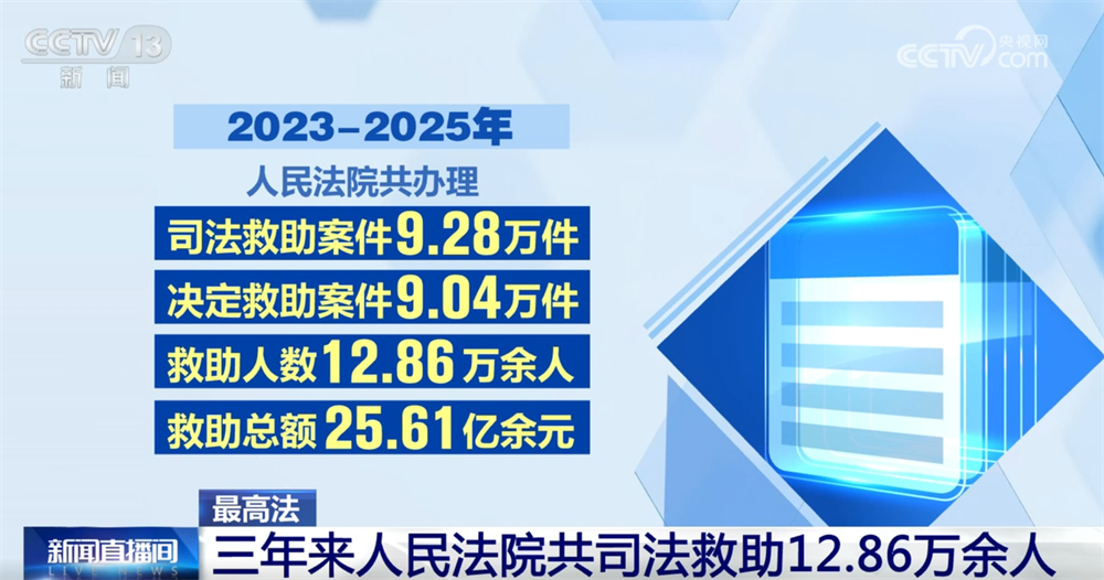 国家司法救助的对象是涉诉困难群众。2023—2025年,人民法院共办理司法救助案件9.28万件,决定救助案件9.04万件,救助人数12.86万余人,救助总额25.61亿余元,让一大批困难当事人摆脱了生活困境,充分感受到公平正义与司法温暖,促进了社会和谐稳定。