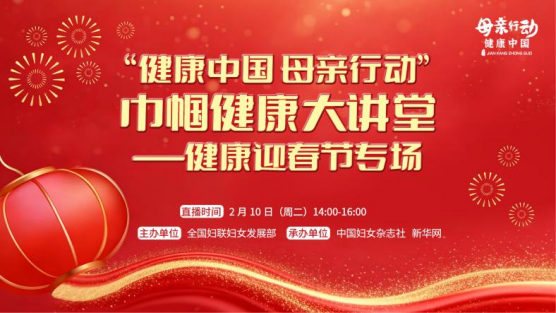 2月10日(周二)14:00—16:00,由全国妇联主办的“健康中国·母亲行动”巾帼健康大讲堂——春节专场直播活动将温暖上线。活动将围绕春节饮食调养、脾胃养护、防未病理念等内容,邀请权威中医专家为广大群众送上专业、实用的健康指导。