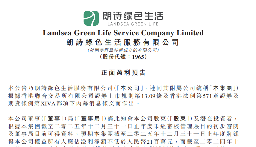 公告显示,朗诗绿色生活预期截至2025年12月31日止年度,将录得公司权益所有人应占溢利净额不低于2100万元,而2024年同期则录得公司权益所有人应占亏损净额约为3.18亿元。