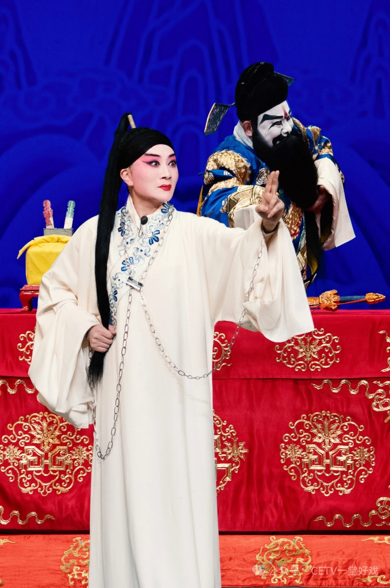 《大堂》这一场是全局的高潮,无论是唱念还是做表,都十分考验演员表演的爆发力与感染力,在路洁的精彩演绎下,观众无不被宁死不屈的谢瑶环所深深感动。一句“忽听得堂上一声喊”,如穿云裂帛一般,瞬间点燃了全场。当唱到“自古道忠臣不怕死”,“死”字戛然上挑,声裂云霄,仿佛将人物全部的愤慨、不屈与决绝推至顶点。谢瑶环深受重刑后被押解上堂,路洁一套干净利落的甩发,既表现了角色身受重刑疲惫不堪,又尽显其坚韧不屈、绝不向强权折腰的铮铮气节。在这一段中,路洁以情带技、以技传情,尽显谢瑶环不惧生死、不畏强权的浩然之气。