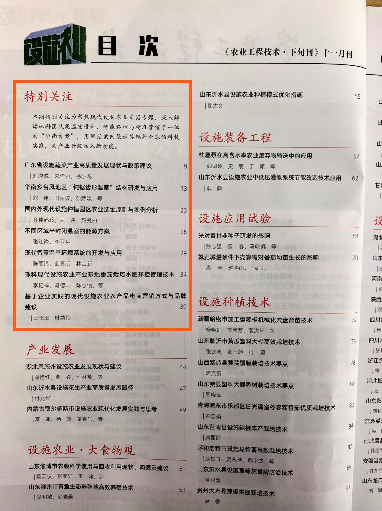 本次专题聚焦“现代设施农业前沿”,采用“专家学术论述+企业实践成果”的联动呈现形式,珠科农业团队自主撰写的5篇实践论文为核心内容,同时特邀行业专家对《广东省设施蔬菜产业高质量发展现状与政策建议》《华南多台风地区“钝锯齿形温室”结构研发与应用》展开深度剖析,理论研究与产业落地深度呼应,专题内容兼具学术高度与实际应用价值。