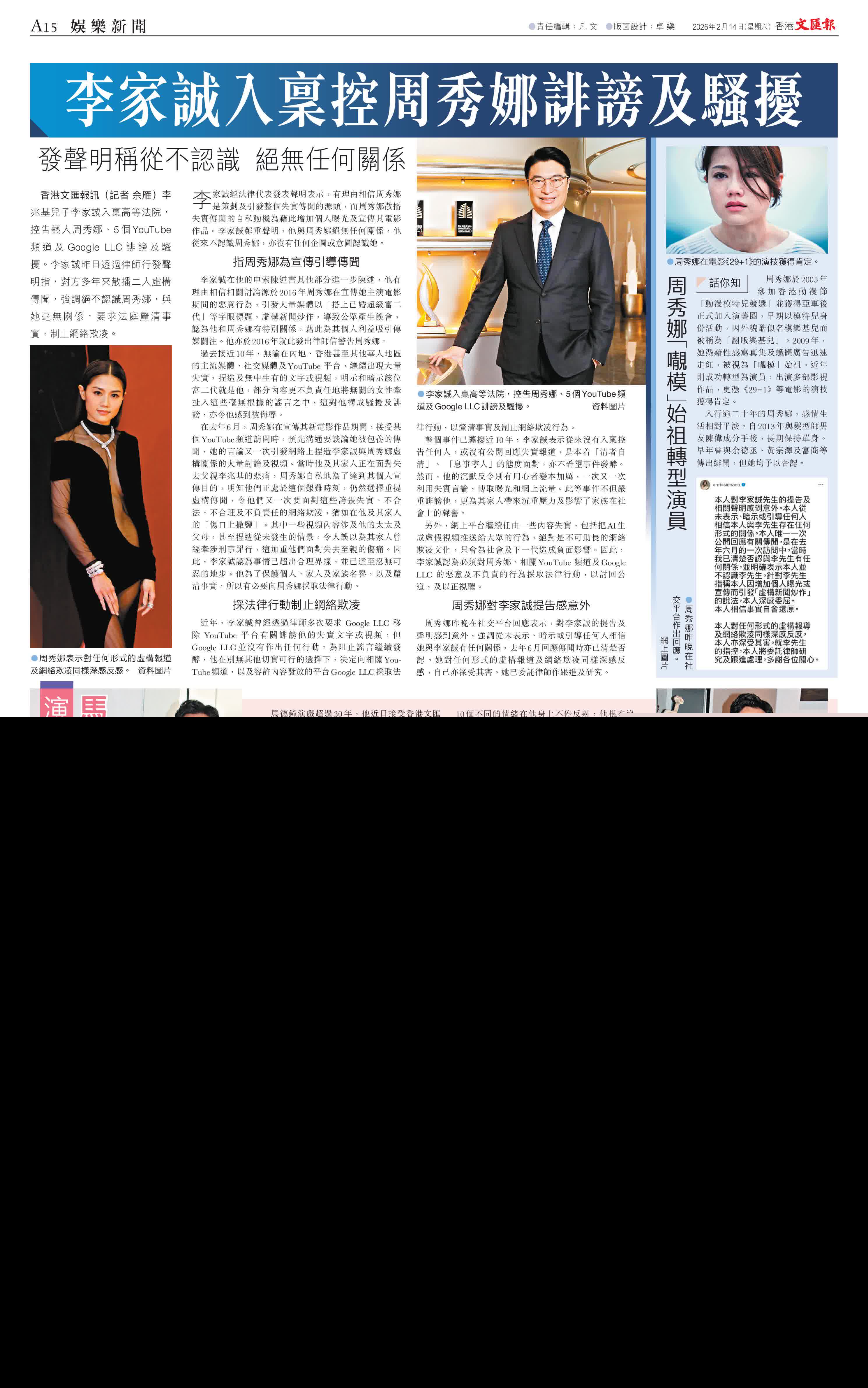 周秀娜昨晚在社交平台回應表示,對李家誠的提告及聲明感到意外,強調從未表示、暗示或引導任何人相信她與李家誠有任何關係,去年6月回應傳聞時亦已清楚否認。她對任何形式的虛構報道及網絡欺凌同樣深感反感,自己亦深受其害。她已委託律師作跟進及研究。