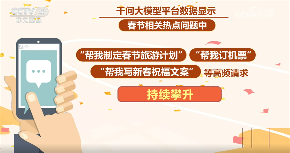 记者在采访中发现,像向昕蕊这样借助AI智能体采购年货的年轻人越来越多。如今的AI早已不只是简单的“问答工具”,而是深度参与人们生活决策的“好帮手”。相关大模型平台数据显示,春节相关热点问题中,咨询健康与作息类问题占比达29%,比如“春节饭菜隔夜还能吃吗”“怎样更容易入睡”;学习解题类问题占比17%;生成新年文案、写真等内容类需求占比10%。此外,“帮我制定春节旅游计划”“帮我订机票”“帮我写新春祝福文案”等高频请求也持续攀升。