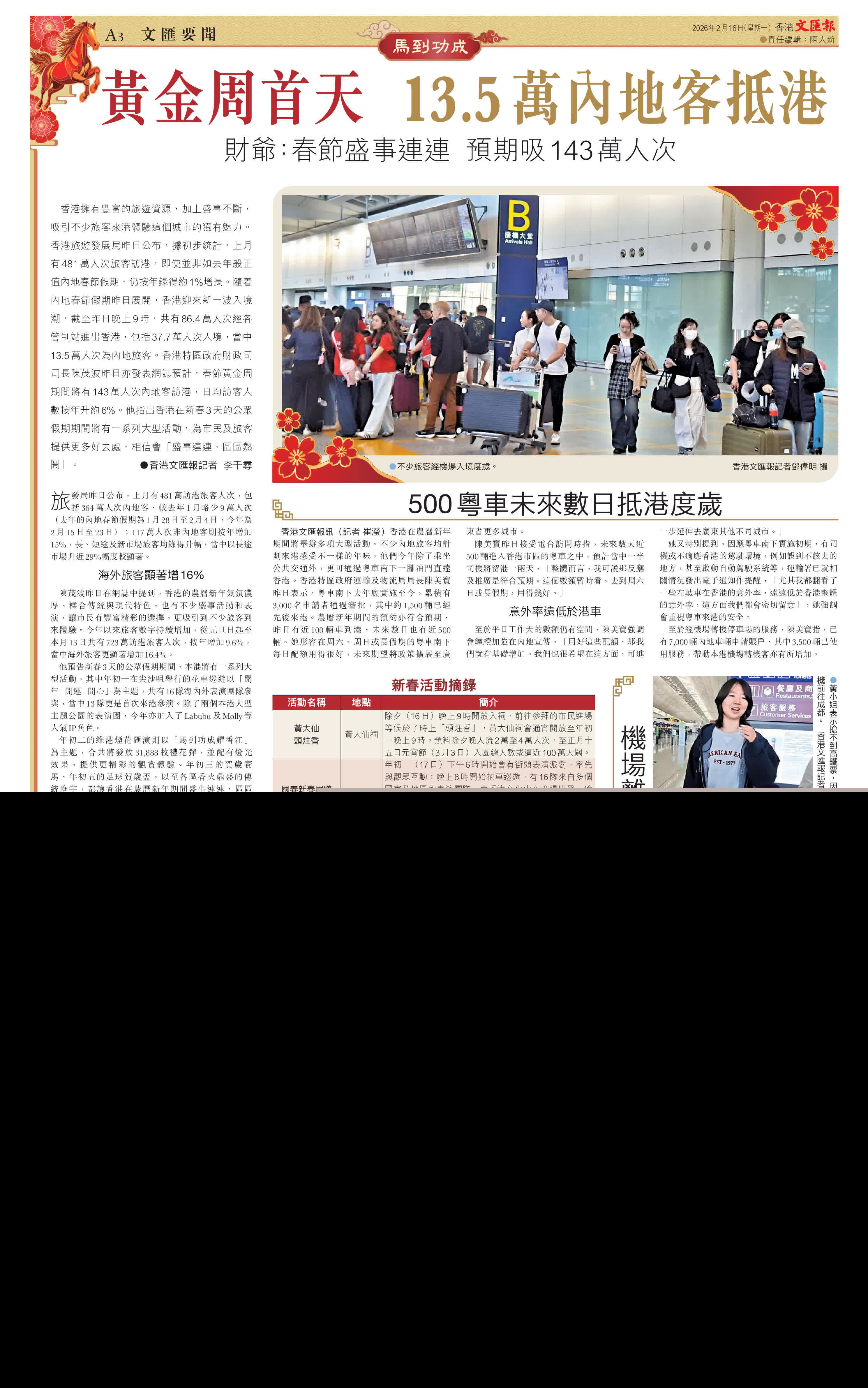 (香港文匯報記者 李千尋)香港擁有豐富的旅遊資源,加上盛事不斷,吸引不少旅客來港體驗這個城市的獨有魅力。香港旅遊發展局昨日公布,據初步統計,上月有481萬人次旅客訪港,即使並非如去年般正值內地春節假期,仍按年錄得約1%增長。隨着內地春節假期昨日展開,香港迎來新一波入境潮,截至昨日晚上9時,共有86.4萬人次經各管制站進出香港,包括37.7萬人次入境,當中13.5萬人次為內地旅客。香港特區政府財政司司長陳茂波昨日亦發表網誌預計,春節黃金周期間將有143萬人次內地客訪港,日均訪客人數按年升約6%。他指出香港在新春3天的公眾假期期間將有一系列大型活動,為市民及旅客提供更多好去處,相信會「盛事連連、區區熱鬧」。