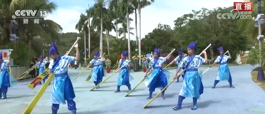这里是海南三亚丝路欢乐世界,国内外的游客共同相聚在这里,一起在这里过年非常热闹。小广场上,演员们表演迎宾舞欢迎各地宾朋的到来。从他们穿着的服装和拿着的船桨道具就感受到了清新浪漫的海洋风情。海南是古代海上丝绸之路的核心要道,也是二十一世纪海上丝绸之路重要战略支点。这个迎宾舞向游客们传递的丝路精神,寓意着从古代丝路到自贸港开放传承不息、续写新篇。传统年俗遇上新潮科技 醒狮机犬闹新春