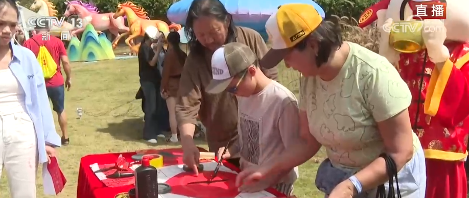 而在旁边,有一群特殊的“演员”正在与舞狮队伍打擂台。平日里充满未来感的机器人和机器狗,还换上了炫酷喜庆的服装,随着音乐节奏变换着不同的动作和现场的游客互动跳舞,特别是这几只机器狗,就像喜庆的小狮子,摇头摆尾特别可爱。品年味 赏年俗 中外游客体验非遗这边则是更加沉浸、参与感更强的非遗体验区。这里热火朝天、欢声笑语不断,现场的游客在黎族阿妹的带领下已经跳起了竹竿舞。竹竿舞又称“打柴舞”,是黎族最古老、最受欢迎的舞种之一,也是国家级非物质文化遗产。现在不仅是黎族也是我们各族群众都很喜欢,共同参与的一项节庆活动,大家也在跳跃间跃马启新程。