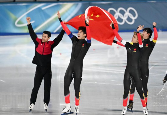2月17日,中国队选手宁忠岩、李文淏、刘瀚彬、吴宇(从左至右)在赛后庆祝。新华社记者 武巍 摄