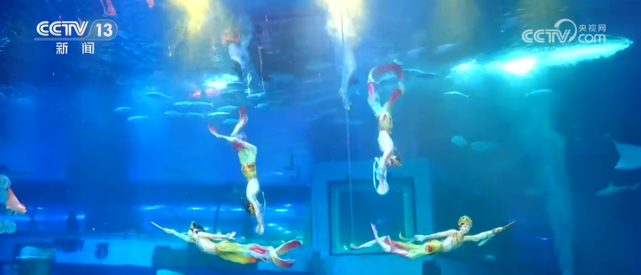 英歌表演刚歇,古典悠远的敦煌乐声渐起。表演者怀抱琵琶从水面缓缓潜入缸中,重现敦煌壁画中的飞天神韵。随后,多名身着飞天服饰的水中舞者从鱼群间轻盈游出,在水中舒展身姿,展现出独特的敦煌余韵。