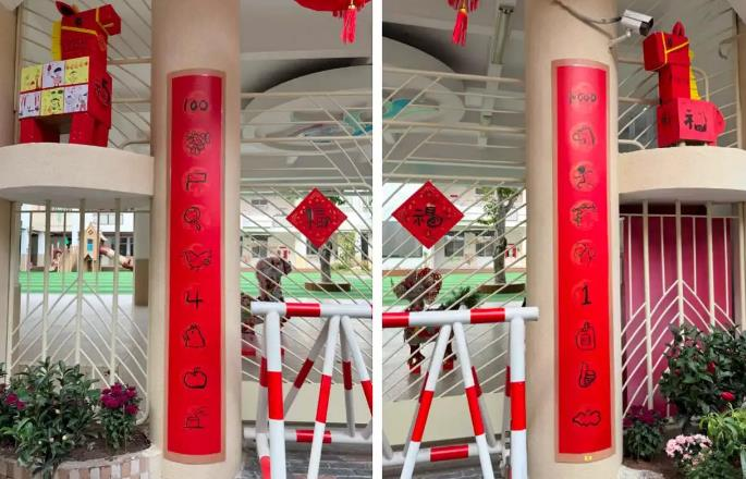 ·有游客发现泉州市实验幼儿园门口的春联由图案、数字和符号组成,十分“烧脑”。幼儿园蔡老师介绍,该春联出自中班孩子之手,上联为“万马奔腾期一年好运”,孩子用气球谐音“期”;下联是“百花齐放迎四季平安”,以100代“百”、放大镜代“放”、老鹰谐音“迎”,用创意符号传递祝福。